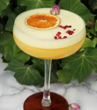 Garnish: Dehydrated orange slice, Rose Buds & Pink Peppercorns
