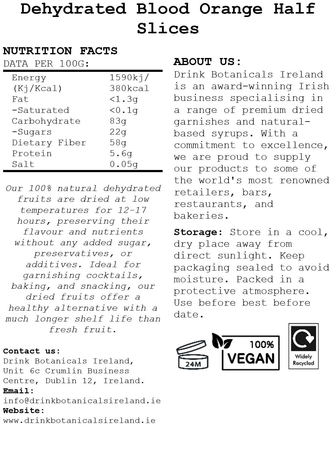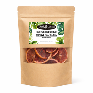 Our Dehydrated Blood Orange Half Slices are carefully dried to remove moisture while preserving their deep ruby colour, bold citrus flavour, and distinctive berry-like aroma. Using a low-temperature dehydration process, we maintain maximum nutrients with no added sugar, preservatives, or additives — just 100% natural blood orange.