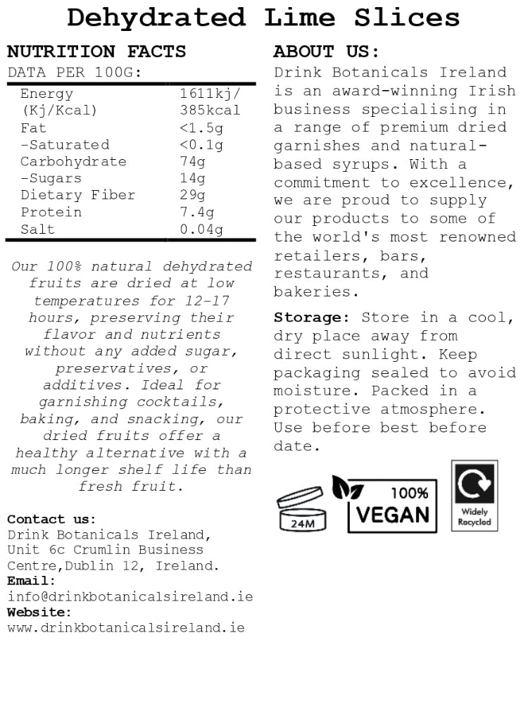 Drink Botanicals Ireland’s dehydrated lime slices can be used in a variety of ways, including as a garnish for cocktails or as a flavouring in teas and other beverages. They can also be used as a snack and can be added to recipes for a tart, citrusy flavour.