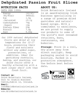 Immerse yourself in the vibrant flavour of our dehydrated passion fruit slices, delivering a delightful blend of sweetness with a hint of tartness. Perfect for elevating cocktails, especially the iconic passionfruit and pornstar martinis.