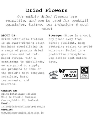 Elevate your culinary and beverage creations with Drink Botanicals, Ireland’s culinary-grade, food-safe edible dried flowers. Perfect for garnishing cocktails, decorating cakes, or infusing herbal teas, our 100% natural edible dried flowers boast a 2-year shelf life.