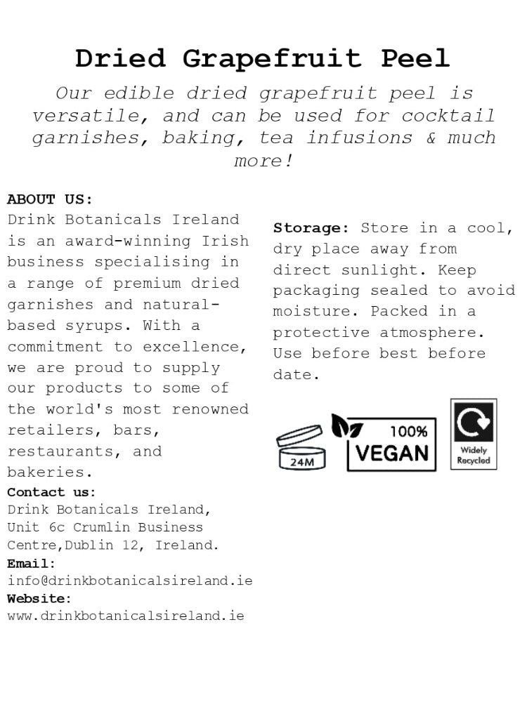 Drink Botanicals Ireland’s dried grapefruit peel is made by removing the peel from the grapefruit and drying it out until most of the moisture is removed. The resulting product is a flavorful and aromatic ingredient that can be used in a variety of culinary applications.