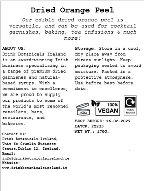 Elevate your drinks and recipes with the vibrant, citrusy aroma of premium-quality dehydrated dried orange peel from Drink Botanicals Ireland. Made from carefully selected oranges and gently air-dried to preserve their natural oils, flavour, and fragrance, this versatile ingredient is perfect for everything from craft cocktails and gin distillation to baking, infusions, tea infusions, and garnishing.