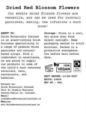 Bold, vibrant, and beautifully eye-catching, our Dried Red Blossom Carnation Flowers are a striking botanical addition that adds rich colour and natural elegance to any creation. With their deep crimson hue and soft floral form, they’re perfect for adding drama and luxury to food and drink.