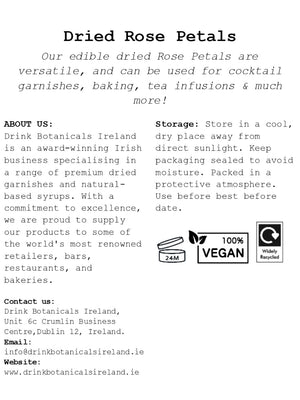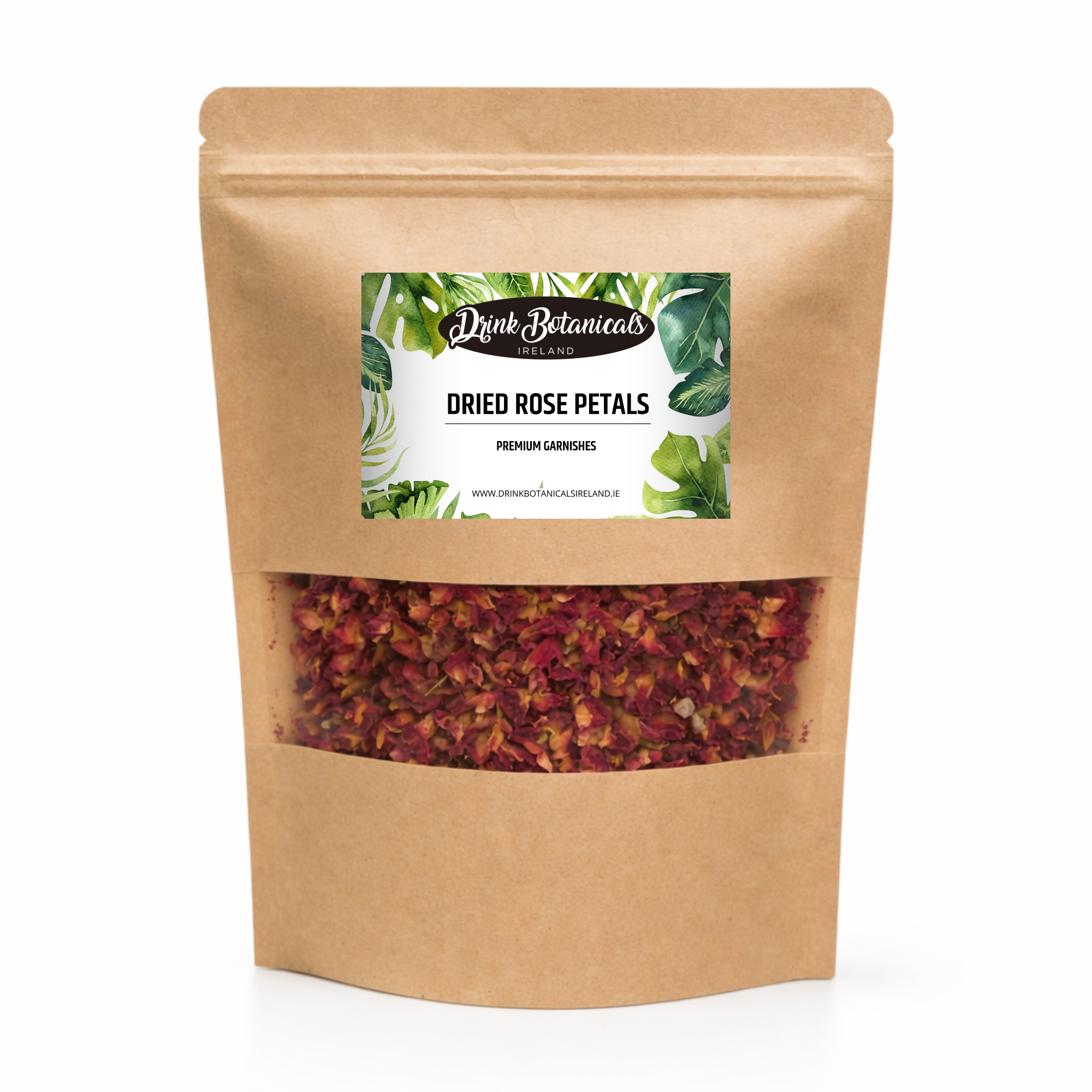 Drink Botanicals Ireland’s dried rose petals can be used in a variety of ways. They add a unique floral flavor and aroma to teas and infusions and can also be used as a decorative element in cocktails and other beverages. They can also be added to baked goods, salads, and other dishes for their aesthetic appeal and subtle rose flavor.
