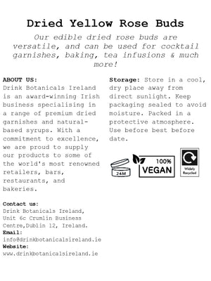 Dried yellow rose buds are the dehydrated buds of yellow roses. Yellow roses are a type of rose that have yellow petals and are often used in gardens and floral arrangements. When the buds are dried, they retain their colour and shape and can be used for a variety of purposes, including culinary, decorative, and aromatherapy uses. Dried yellow rose buds have a delicate and sweet floral aroma and flavor and can add a unique and pleasant taste and scent to dishes and beverages. They can also be used in crafts, potpourri, and other decorative arrangements. In addition, dried yellow rose buds are believed to have health benefits, including anti-inflammatory and antioxidant properties, and are sometimes used in skincare products.