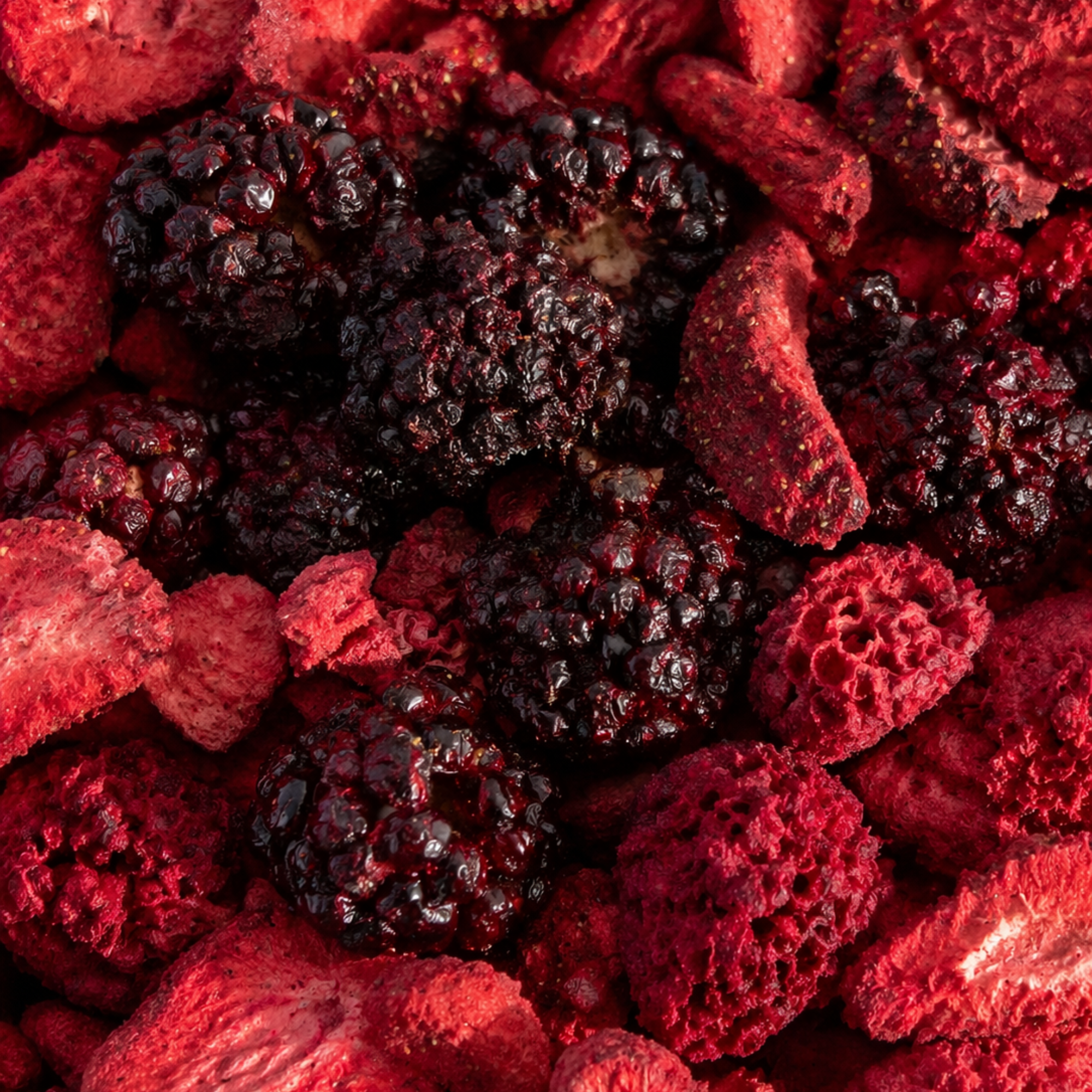 Freeze-drying removes water while locking in the fruit’s natural goodness, resulting in crisp, flavour-packed berries that taste just-picked. Because the water is removed, the fruit becomes highly concentrated—100g of freeze-dried berries is approximately equivalent to 700–900g of fresh fruit.