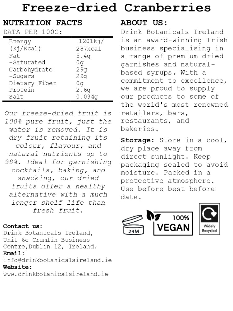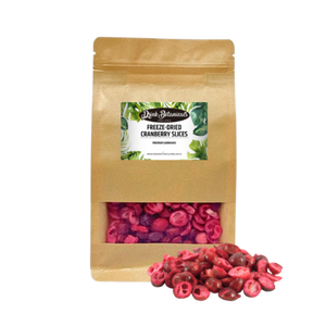 Freeze-dried cranberries are dehydrated down to 10 per cent of their original water content without preservatives or sugar and have a strong, natural flavour. They can be eaten as they are or added to drinks such as smoothies or reconstituted with water. Freeze-drying is the healthiest and ideal way of preserving them without using preservatives.