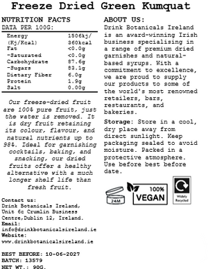 Whether you're crafting artisan cocktails or enhancing a culinary presentation, Drink Botanicals Ireland Freeze Dried Kumquats are the perfect ingredient to keep on hand.