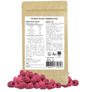 Freeze Dried raspberries are pure raspberries that are dehydrated to one-seventh of their original weight with no additives or nasty stuff! They can be reconstituted as desired, with less than 20g making up one of your “five-a-day”.