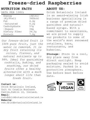 - Order Now: Experience the remarkable flavor and versatility of Drink Botanicals Ireland’s freeze dried raspberries. Unlock new possibilities in your cocktail creations, soap making, tea infusions, and desserts. Don’t miss out on the opportunity to enhance your culinary repertoire with our award-winning freeze dried raspberries. Place your order today and discover the difference that premium quality makes.