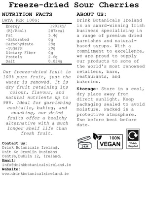 Overall, Drink Botanicals Ireland’s freeze-dried sour cherries are a versatile ingredient that adds a tart and fruity flavor to a variety of culinary applications. With their high nutrient content and unique flavor profile, they are a great addition to any kitchen or bar.