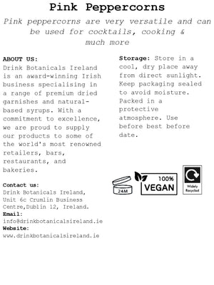 Pink peppercorns can be used to add a unique flavour, colour, and aroma to both drinks and cooking. They pair well with citrus flavours and can be used to infuse cocktails, as a garnish, or in a variety of culinary dishes.
