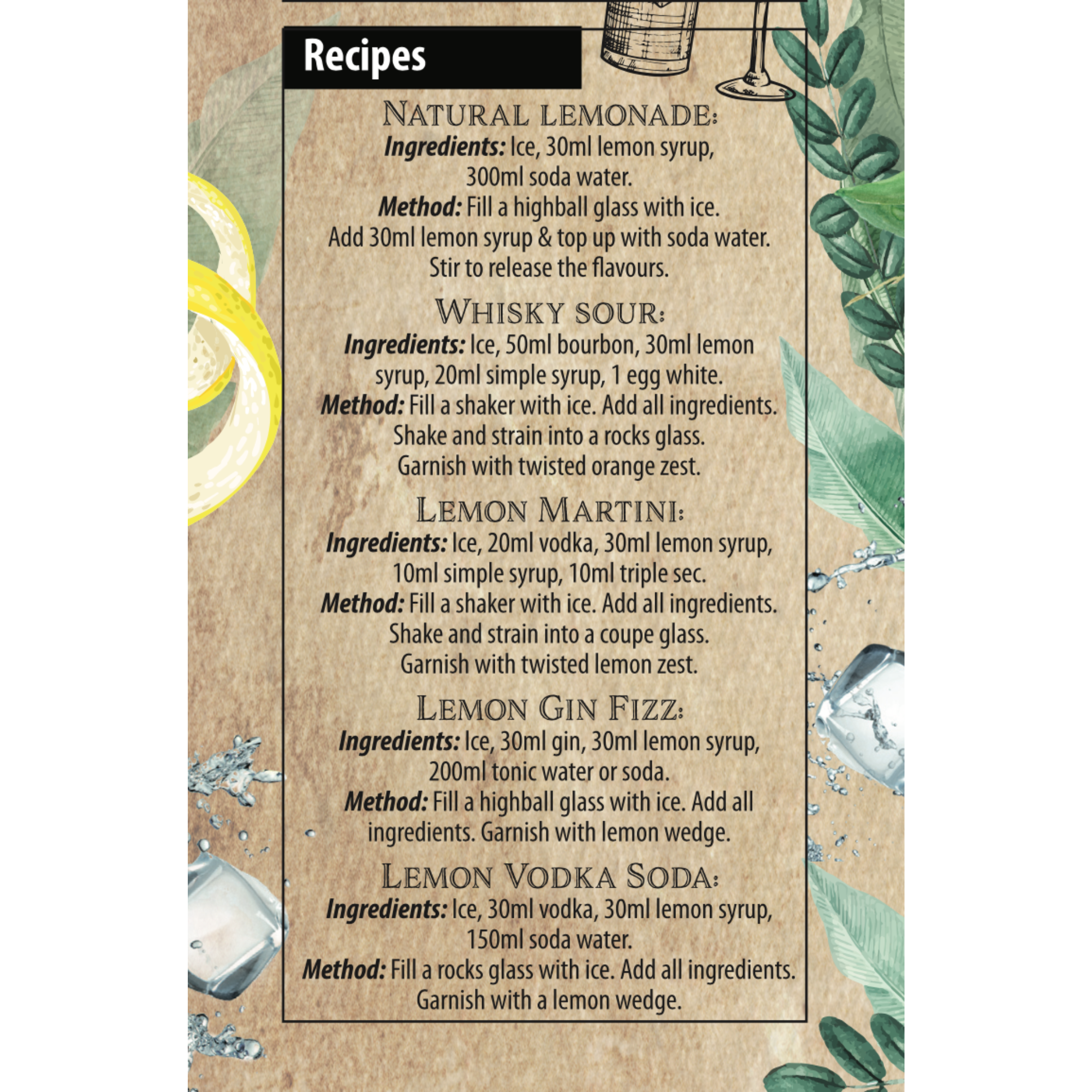 Recipes: Every bottle of lemon syrup contains six recipes compiled by international mixologists.