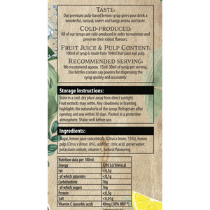 High fruit content: 100ml of lemon syrup is made from 104ml fruit juice and pulp.