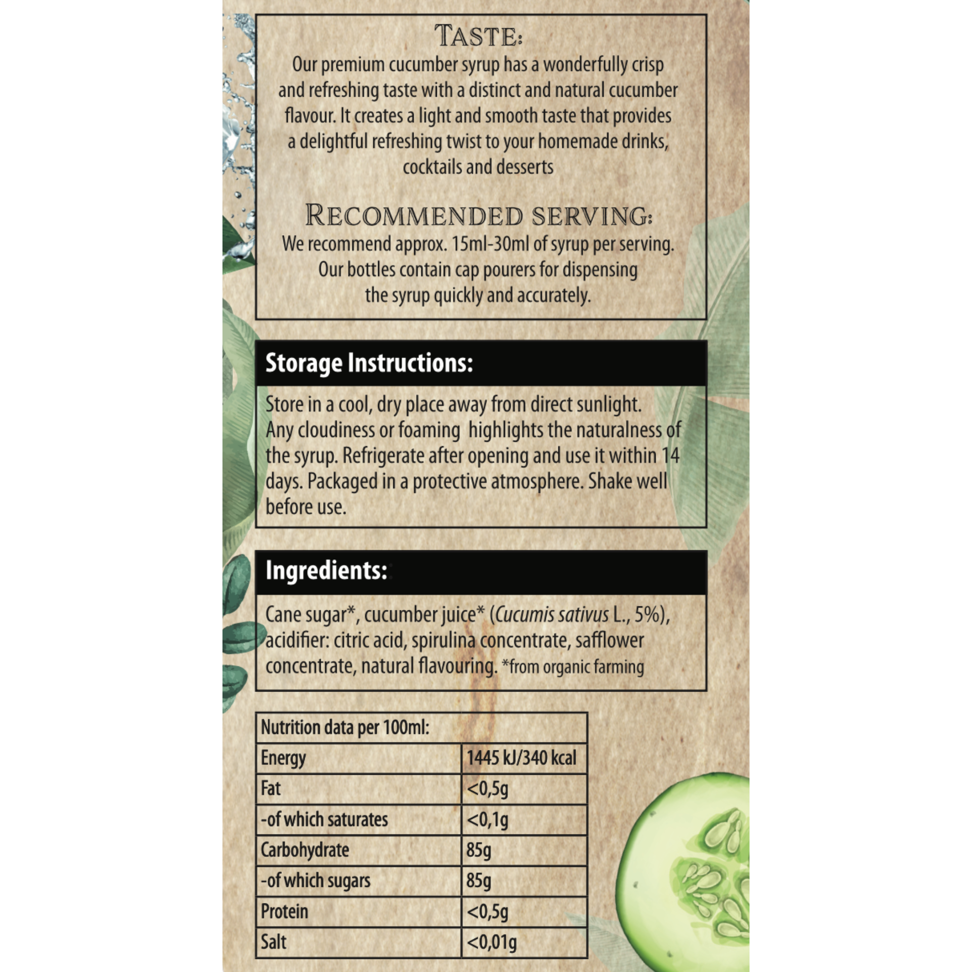Recommended Serving: For the best flavor, we recommend adding approximately 15ml to 30ml of cucumber syrup per serving.