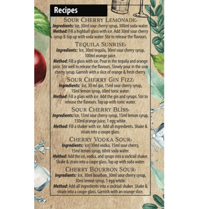 - Selection of Recipes: Every bottle of sour cherry syrup contains a selection of six recipes compiled by international mixologists.
